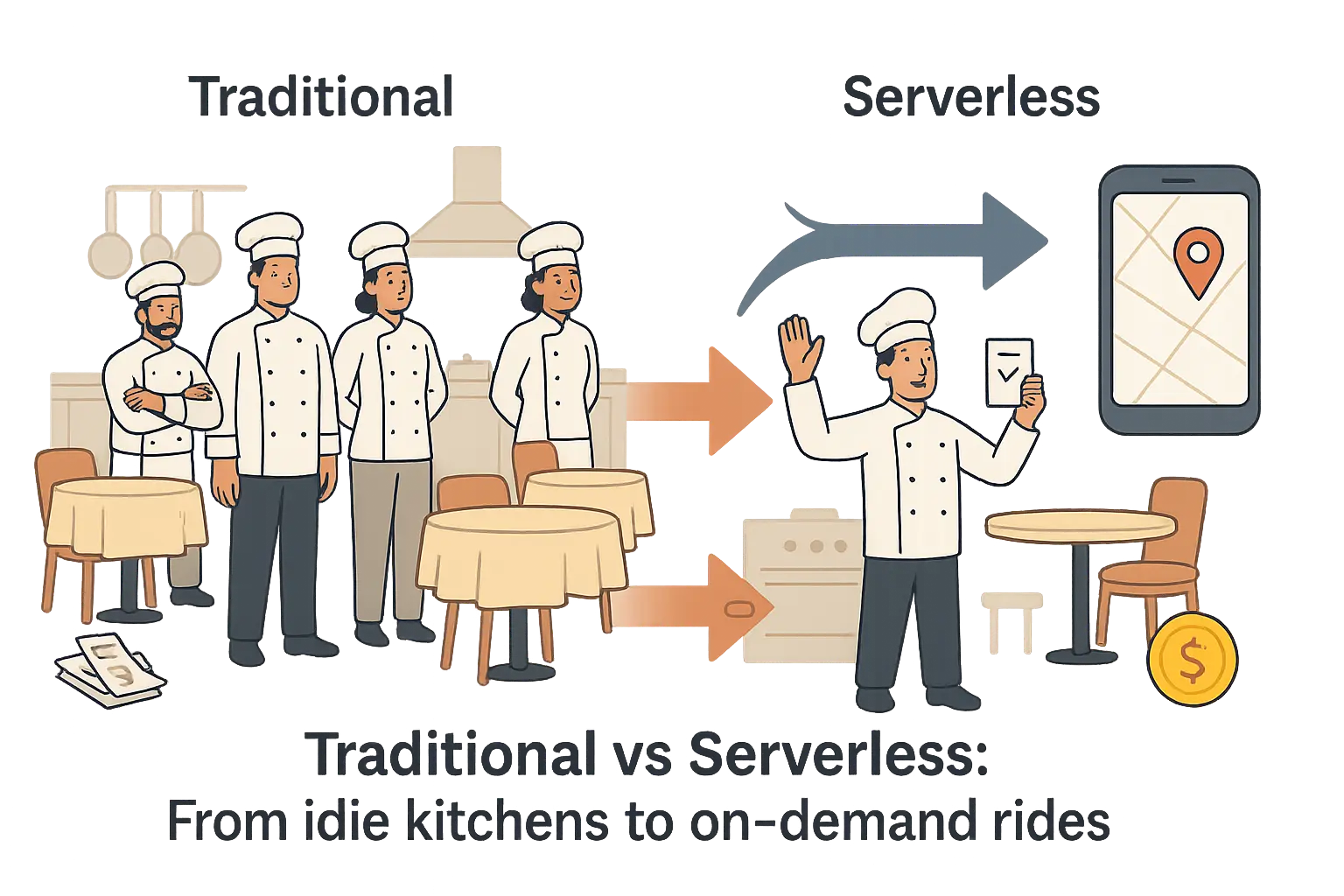 Imagine you run a restaurant. In the traditional setup, you hire full-time chefs, pay rent, buy groceries, and keep the kitchen open all day—even if customers don’t show up. It’s costly, inefficient, and unpredictable.
