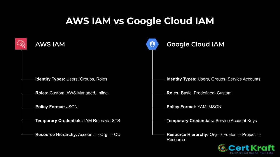 Key Difference: AWS separates users and roles clearly, while GCP emphasizes service accounts as the default identity for workloads.